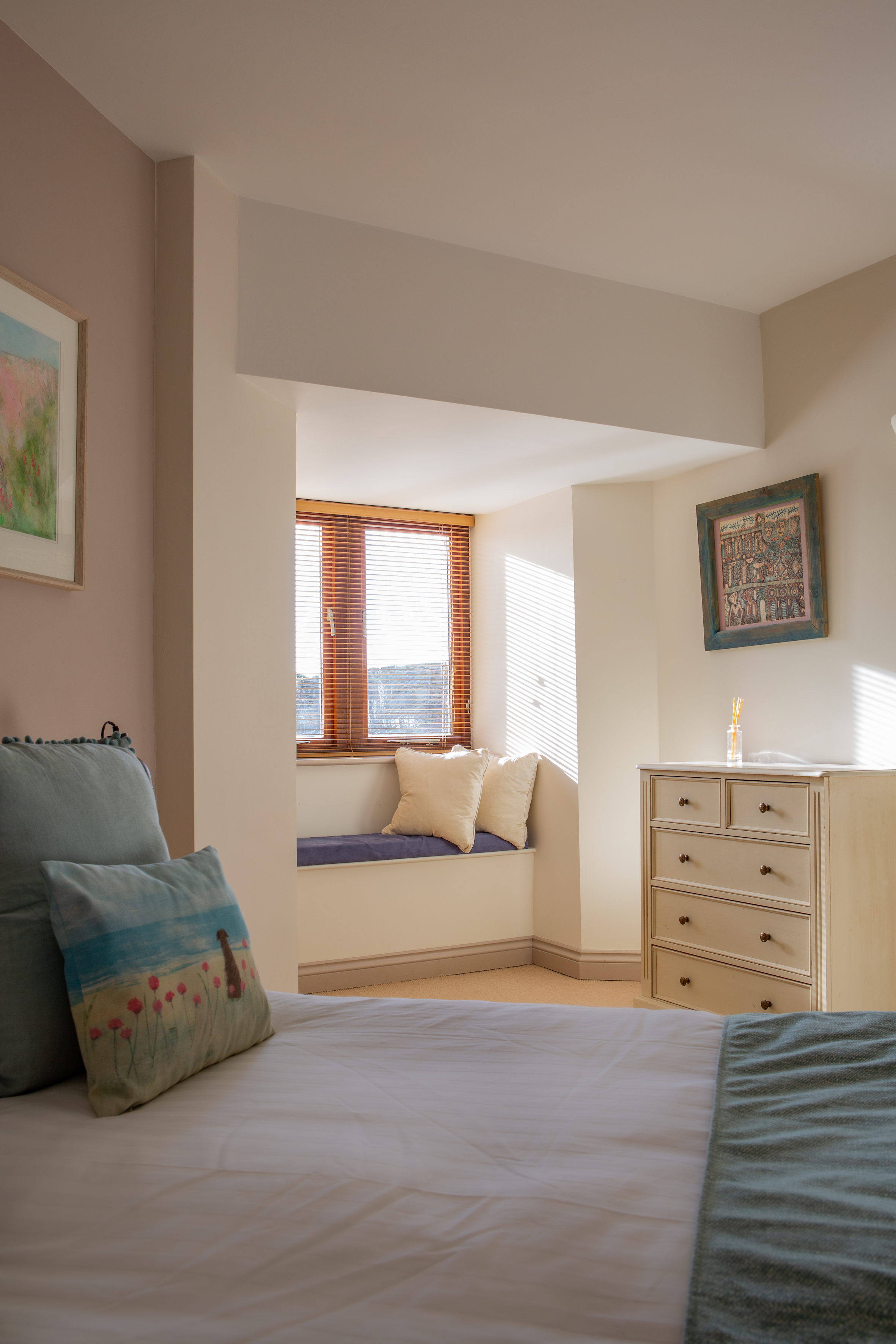 Bright sunny master bedroom with wardrobe, window seat and drawers